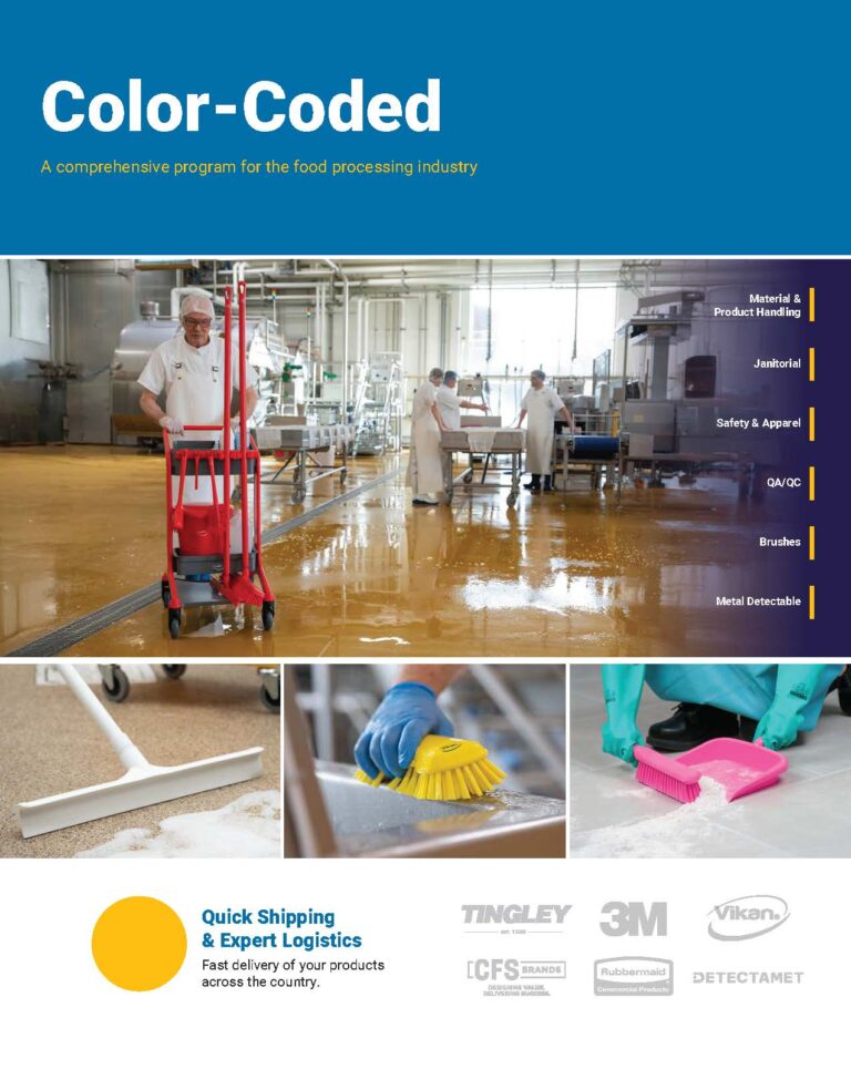 Explore the comprehensive Color-Coded Catalog, designed to meet the diverse needs of industrial and food processing facilities. It features a wide range of high-quality, FDA-compliant Cleaning & Sanitation tools and equipment including brushes, brooms, scrapers, containers, safety gear, floor marking tapes, shadow boards, and the innovative Vikan® HyGo Mobile Cleaning Station.